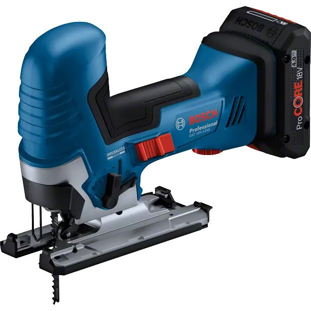 "Bosch GST 18V-125 S PROFESSIONAL. Handle type: Barrel grip, Product colour: Black, Blue, Red, Bevel capacity (max): 90°. Idle stroke rate (max): 3500 spm, Cutting depth in wood: 12.5 cm, Idle stroke rate (min): 500 spm. Power source: Battery, Battery voltage: 18 V. Weight: 1.9 kg, Width: 78 mm, Depth: 242 mm"\n