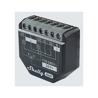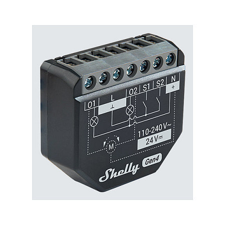 "Shelly 2PM Gen4. Product type: Blind/shutter actuator, Flash memory (microcontroller): 8000 KB, Channels quantity: 2 channels. Wi-Fi standards: 802.11b, 802.11g, Wi-Fi 4 (802.11n), Wi-Fi 6 (802.11ax), Wi-Fi frequency: 2.4 GHz. Power source type: AC, Power: 1.4 W, Input voltage: 110 - 240 V. Width: 42 mm, Depth: 16 mm, Height: 37 mm"\n"A 2-channel smart switch for control of curtains, blinds, and shutters. Features power metering and multiprotocol support (Wi-Fi, Zigbee, Matter, Bluetooth).