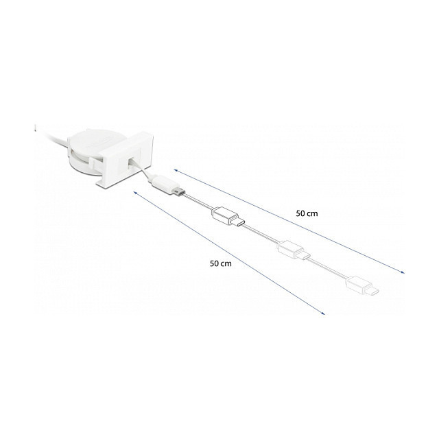 "DeLOCK Easy 45 Module USB 2.0 Retractable Cable USB Type-A to EASY-USB Type Micro-B white. Cable length: 0.62 m. Connector 1: USB A, Connector 2: Micro-USB B, USB version: USB 2.0, Maximum data transfer rate: 0.48 Gbit/s, Product colour: White"\n"This Easy 45 retractable cable by Delock can be connected to a PC, laptop or power source with USB-A connector and can be used to transfer data or charge various devices with USB Type Micro-B interface. The simple snap-in mechanism ensures that the module is firmly in place and can be easily removed if necessary.