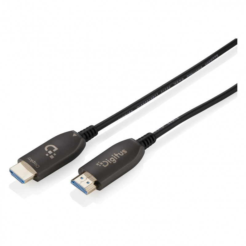 "Digitus HDMI AOC hybrid fiber optic cable, UHD 8K, 60 m. Cable length: 60 m, Connector 1: HDMI Type A (Standard), Connector 1 gender: Male, Connector 2: HDMI Type A (Standard), Connector 2 gender: Male, Connector contacts plating: Gold, HDMI version: 2.1, 3D, Maximum resolution: 7680 x 4320 pixels, Data transfer rate: 48 Gbit/s, Product colour: Black"\n"Transmits uncompressed video and audio signals in 8K at 60 Hz (UHD-2) with a bandwidth of up to 48 Gbps losslessly and without latency