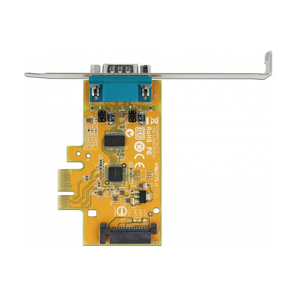 "DeLOCK 90293. Host interface: PCIe, Output interface: RS-232, Expansion card form factor: Low-profile. Chipset: SUN2212, Data transfer rate (max): 0.0001152 Gbit/s, FIFO (First In, First Out): 128 B. Windows operating systems supported: Windows 10, Windows 10 x64, Windows 7, Windows 7 x64, Windows 8.1, Windows 8.1 x64, Server operating systems supported: Windows Server 2008 R2, Windows Server 2012, Windows Server 2012 R2, Windows Server 2016. Package type: Box"\n"The PCI Express card by Delock expands a PC by one external serial port. Connected devices can be optionally supplied with a voltage of 5 V or 12 V. By using the included low profile bracket, the PCI Express card can be also installed into a Mini-PC."