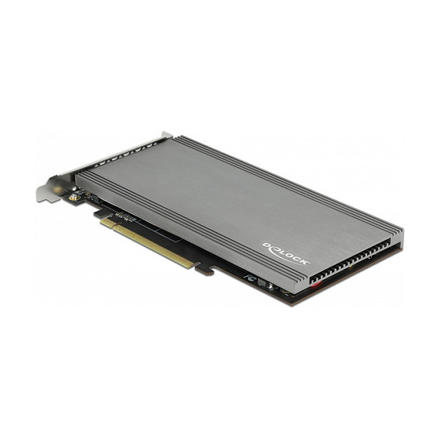 "DeLOCK PCI Express x16 Card to 4 x internal NVMe M.2 Key M. Host interface: PCIe, Output interface: M.2, Expansion card standard: PCIe 3.0. Product colour: Grey, Cooling type: Active, Number of fans: 1 fan(s). Data transfer rate (max): 32 Gbit/s. Width: 95 mm, Depth: 202 mm, Height: 8 mm"\n"This PCI Express card by Delock expands the PC by four M.2 slots. Up to four M.2 SSDs in format 2280, 2260, 2242 and 2230 can be connected. With the help of the large heat sink and the fan, sufficient cooling of the M.2 modules is guaranteed.