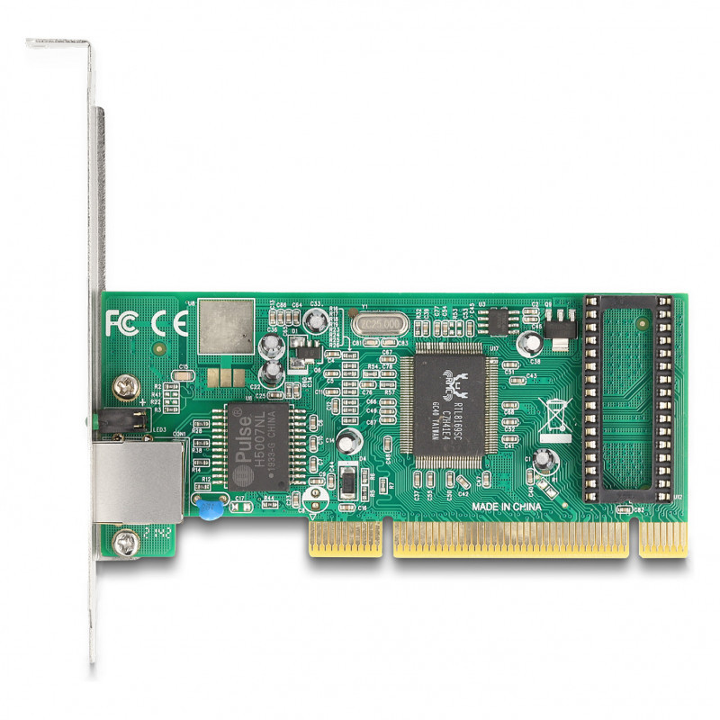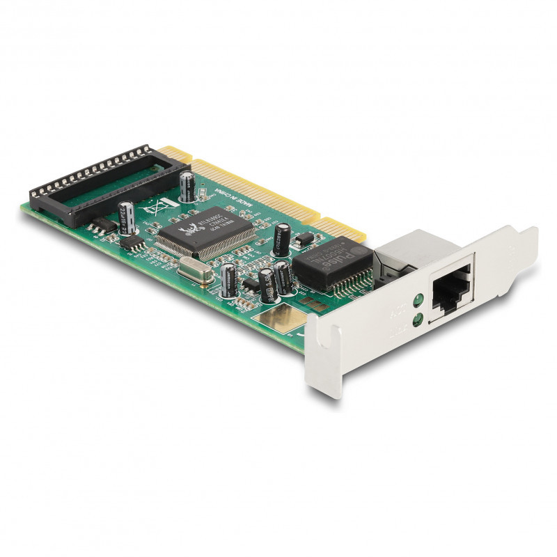 "DeLOCK PCI Card to 1 x RJ45 Gigabit LAN RTL. Host interface: PCI, Output interface: RJ-45, Expansion card form factor: Full-height / Low-profile. Product colour: Green, Grey, LED indicators: Activity, Link, Country of origin: China. Data transfer rate (max): 1 Gbit/s. Windows operating systems supported: Windows 10, Windows 11, Windows 8.1. Quantity per pack: 1 pc(s), Package type: Box"\n"The PCI Gigabit LAN card by Delock offers one network port with a data transfer rate up to 1000 Mbps."