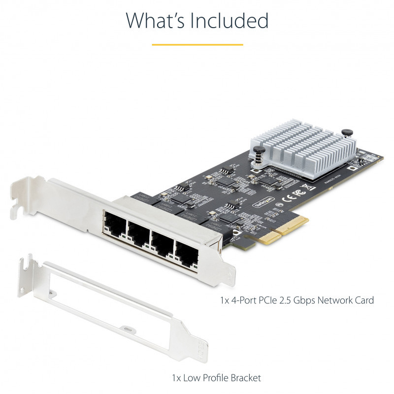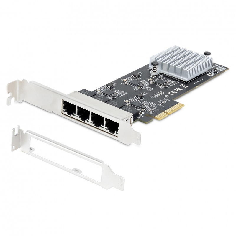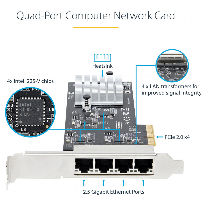 "StarTech.com 4-Port 2.5Gbps NBASE-T PCIe Network Card, Intel I225-V, Quad-Port Computer Network Card, Multi-Gigabit NIC, PCI Express Server LAN Card, Desktop Ethernet Interface. Internal. Connectivity technology: Wired, Host interface: PCI Express, Interface: Ethernet. Maximum data transfer rate: 2500 Mbit/s. Product colour: Black"\n"Quad-port PCIe network card with Intel® I225-V chip features multi-Gigabit speeds with NBASE-T support