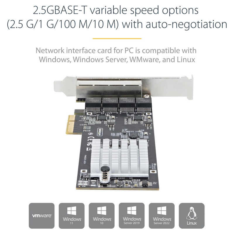 This quad-port 2.5GbE network interface card (NIC) features independent Intel I225-V chipsets for each port with Intel vPro technology, to enhance performance and data integrity across four 2.5G ethernet connections. The variable multispeed options (2.5/1Gbps and 100/10Mbps) enable support for both new and legacy network hardware. Utilize existing Cat5e or CAT6 cabling infrastructure while adding NBASE-T (802.3bz) compatibility for seamless integration.