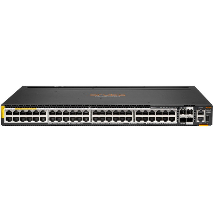 "HPE Aruba Networking CX 6300M 48p Smart Rate 1G/2.5G/5G Class8 PoE 2p 50G 2p 25G Switch. Switch type: Managed. Basic switching RJ-45 Ethernet ports type: 5G Ethernet (100/1000/5000), Basic switching RJ-45 Ethernet ports quantity: 48, Console port: RJ-45/USB Type-C. Switching capacity: 880 Gbit/s. Networking standards: IEEE 802.3af, IEEE 802.3at, IEEE 802.3bt. Power over Ethernet (PoE)"\n"The HPE Aruba Networking CX 6300 Switch Series is a modern, flexible, and intelligent family of stackable switches ideal for access, aggregation, and data center top-of-rack (ToR). Featuring a cloud-native design and fully programmable operating system (OS). The CX 6300 delivers advanced monitoring and troubleshooting with capabilities like a real-time network analytics engine, HPE Aruba Networking Switch Multi-Edit Software and flexible deployment options to implement and validate network configurations. A powerful Gen7 ASIC architecture delivers fast, non-blocking performance for AI, Wi-Fi 7, and Internet of Things (IoT) requirements. HPE Aruba Networking Virtual Stacking Framework (VSF) allows for stacking of up to 10 switches, providing scale and simplified management. This flexible series has built-in high-speed uplinks and supports high-density IEEE 802.3bt high-power PoE with HPE Smart Rate multi-gigabit Ethernet.