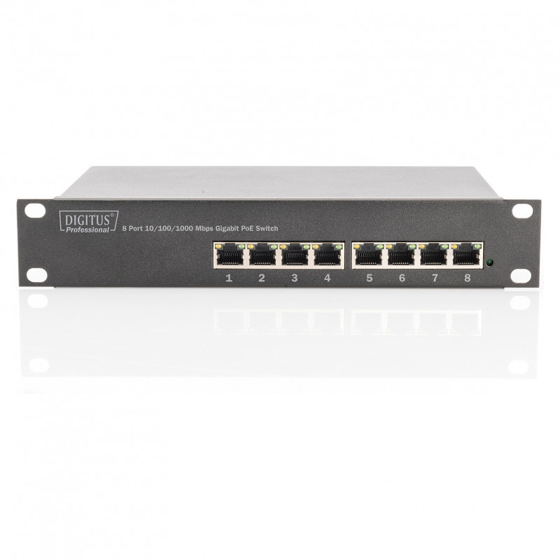 The DIGITUS DN-95317 is a compact 10"" Gigabit PoE+ switch with eight RJ45 ports that provides a reliable power and data supply for modern IP-based network devices. Thanks to support for the PoE standards IEEE 802.3af and 802.3at (PoE+), the switch supplies connected devices such as access points, IP cameras, VoIP telephones or IoT systems with power directly via the network cable - additional power supply units on the end devices are no longer required. Thanks to its 10"" compatible design, the switch is particularly suitable for compact network cabinets, small server racks or decentralized installations in offices, retail, residential complexes or technical utility rooms. The fanless design enables completely silent operation and makes the switch ideal for noise-sensitive environments. The Gigabit Ethernet ports ensure fast data transfers and stable network connections for demanding PoE applications. With functions such as non-blocking switching, auto-negotiation and store-and-forward technology, the switch guarantees reliable network performance - without any configuration effort."