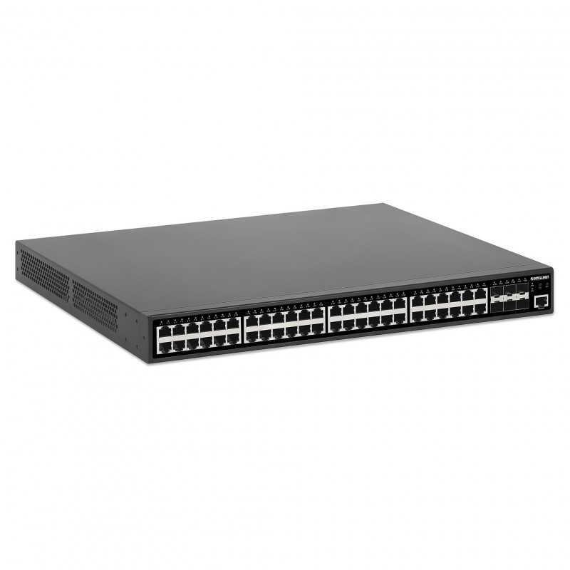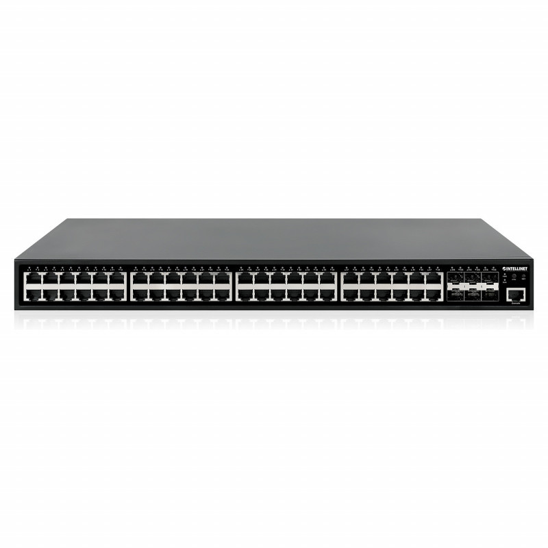 "Intellinet 48-Port Gigabit Ethernet PoE+ Layer 2+ Managed Switch with Six 10G SFP+ Uplinks IEEE 802.3at/af (PoE+/PoE) Compliant, 450 W PoE Power Budget, Layer 2+/Layer 3 Lite, 6 x 10G SFP+ Open. Switch type: Managed, Switch layer: L2+"\n"54-port 450 W Gigabit Ethernet PoE+ Layer 2+ Managed Switch with Six 10G Uplinks - a powerhouse of Power over Ethernet, ports and Self-Healing Network features
