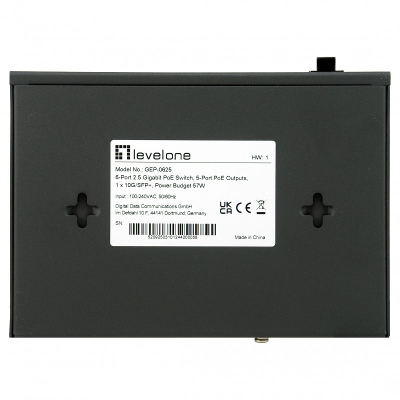 "LevelOne GEP-0625. Switch type: Unmanaged. Basic switching RJ-45 Ethernet ports type: 2.5G Ethernet (100/1000/2500), Basic switching RJ-45 Ethernet ports quantity: 5. Full duplex. MAC address table: 15000 entries, Switching capacity: 35 Gbit/s. Networking standards: IEEE 802.3ab, IEEE 802.3ae, IEEE 802.3af, IEEE 802.3at, IEEE 802.3bt, IEEE 802.3bz, IEEE 802.3u,.... DC input voltage: 52 V. Power connector: DC-in jack. Power over Ethernet (PoE)"\n"The LevelOne GEP-0625 switch delivers exceptional performance with multi-gigabit PoE ports and a high-speed uplink, making it an ideal solution for businesses seeking to scale their networks with efficiency and ease. Whether for small businesses, branch offices, or home setups, this switch offers high performance and versatility for any network configuration.