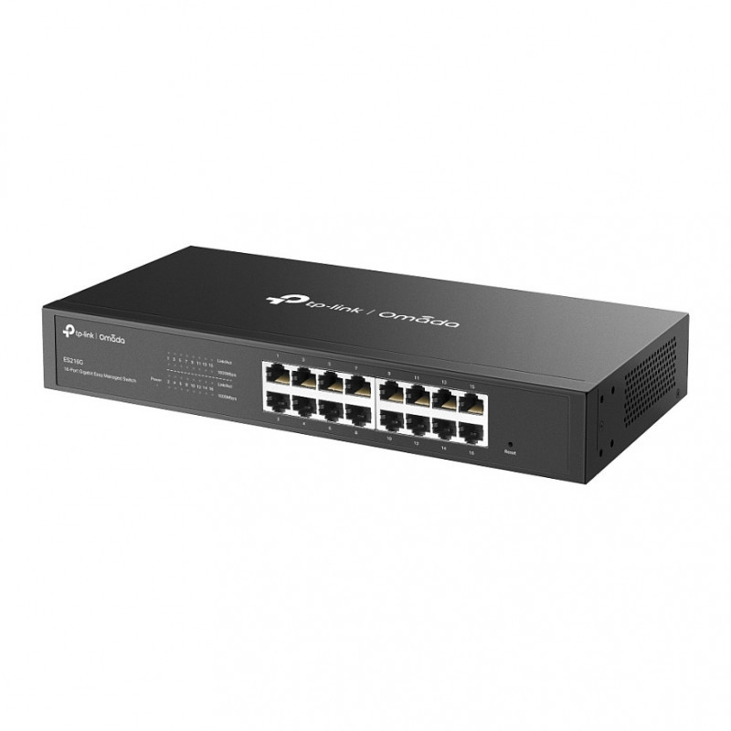 "TP-Link Omada ES216G. Switch type: Managed, Switch layer: L2. Basic switching RJ-45 Ethernet ports type: Gigabit Ethernet (10/100/1000), Basic switching RJ-45 Ethernet ports quantity: 16. MAC address table: 8000 entries, Switching capacity: 32 Gbit/s. Networking standards: IEEE 802.1Q, IEEE 802.1ab, IEEE 802.1p, IEEE 802.3ab, IEEE 802.3at, IEEE 802.3i, IEEE 802.3x. Power connector: AC-in jack. Rack mounting"\n"Omada Cloud Essentials — A Free and Easy Cloud-Based Network Management