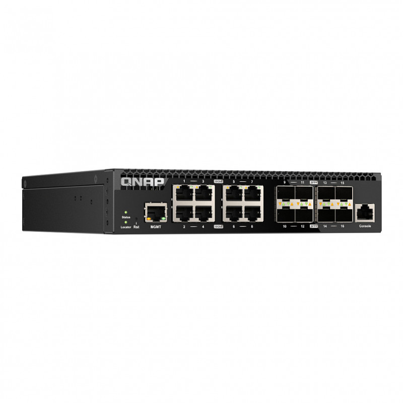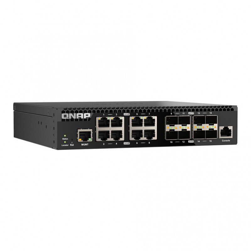 "QNAP QSW-M3216R-8S8T. Switch type: Managed, Switch layer: L2/L3. Basic switching RJ-45 Ethernet ports type: 10G Ethernet (100/1000/10000), Basic switching RJ-45 Ethernet ports quantity: 8, Installed SFP+ modules quantity: 8, Console port: RJ-45. MAC address table: 16000 entries, Switching capacity: 320 Gbit/s. Networking standards: IEEE 802.3, IEEE 802.3ab, IEEE 802.3ae, IEEE 802.3p, IEEE 802.3u, IEEE 802.3x, IEEE 802.3z. Rack mounting, Form factor: 1U"\n"More 10GbE ports and more space-saving at an affordable price. The QNAP QSW-M3216R-8S8T is a half-width rackmount L2 Managed Switch with eight 10GbE SFP+ fiber ports and eight 10GbE RJ45 ports. Supporting Layer 2 switching and network management via a user-friendly web user interface, the QSW-M3216R-8S8T offers flexible deployment in high-speed network environments and provides an entry-level network management solution. With a half-width design, the QSW-M3216R-8S8T can be conveniently placed within working environments without taking up too much space, and two can be installed in a single 1U rack space. The QSW-M3216R-8S8T is made in Taiwan (MIT), providing a high-quality and reliable networking solution.