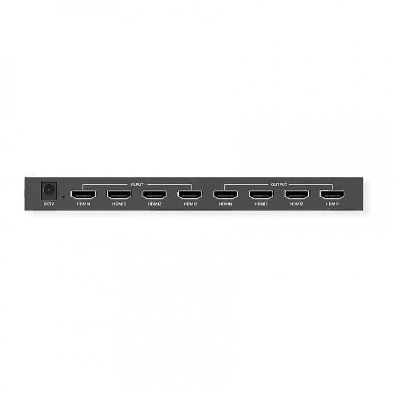 This 4 in 4 out HDMI Matrix can switch 4 HDMI input signals (PC, notebook, etc.) to 4 HDMI displays (monitor, projector, etc.) with resolutions up to 4096x2160@60Hz. It supports multiple switching methods (buttons on the matrix, IR remote control and RS232). Any two of the four HDMI outputs support automatic down-scaling. This matrix can be used in security surveillance, education, training, exhibitions, trade shows, broadcasting, command centers and many other applications.