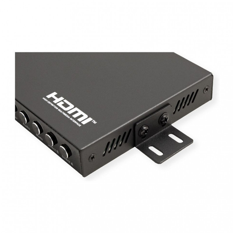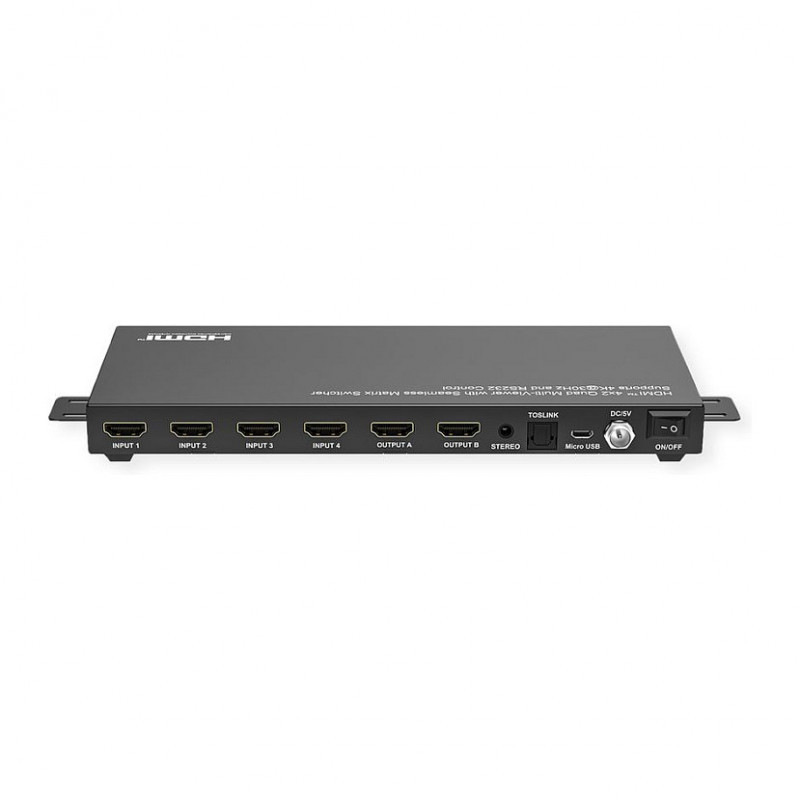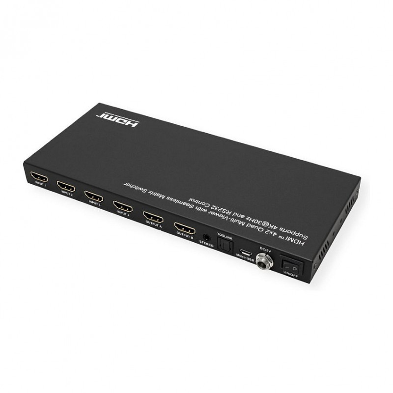 This VALUE HDMI 4x2 Matrix, 4K30Hz Quad Multi Viewer supports four HDMI input sources that can be displayed on one screen with five multi-view modes. The four HDMI inputs can be switched seamlessly. You can control it via the front button, IR control and RS-232 control.