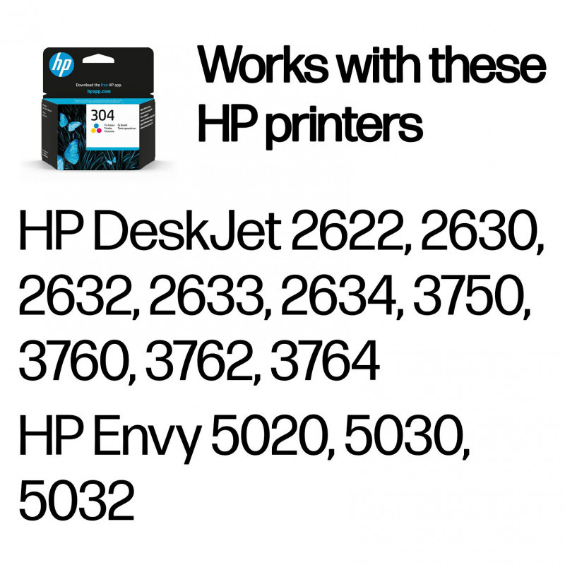 "HP 304 Tri-color Original Ink Cartridge. Colour ink type: Dye-based ink, Cartridge capacity: Standard Yield, Colour ink page yield: 100 pages, Colour ink volume: 2 ml, Printing colours: Cyan, Magenta, Yellow, Quantity per pack: 1 pc(s)"\n"Ideal for creating colour photos and everyday documents with consistent, high-quality results for the life of your cartridge – for an affordable price.