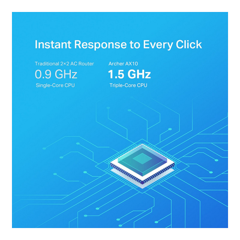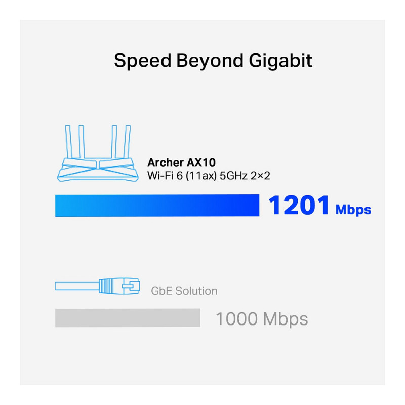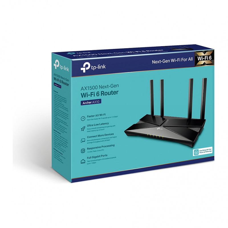 "TP-Link Archer AX1500 Dual-Band Wi-Fi 6 Router, Black. WAN connection type: RJ-45. Wi-Fi band: Dual-band (2.4 GHz / 5 GHz), Top Wi-Fi standard: Wi-Fi 6 (802.11ax), WLAN data transfer rate (max): 1500 Mbit/s. Ethernet LAN interface type: Gigabit Ethernet, Ethernet LAN data rates: 10,100,1000 Mbit/s, Networking standards: IEEE 802.11a, IEEE 802.11ac, IEEE 802.11ax, IEEE 802.11b, IEEE 802.11g, IEEE 802.11n. Security algorithms: 64-bit WEP, 128-bit WEP, WPA, WPA-PSK, WPA2, WPA2-PSK, Firewall security: SPI. Supported network protocols: IPv4, IPv6"\n"Wi-Fi 6 delivers a huge boost in speed and total capacity. Get on the latest Wi-Fi technology to wipe out all the annoying jittering and slow down and enjoy the future network that loads faster and connects more. The latest 1024-QAM and higher symbol rate combine to boost speeds for newer devices to the Gigabit level. Connect to a 1 Gbps Wi-Fi network with your phone or laptop and enjoy speeds comparable to plugging in an Ethernet cable. Wi-Fi 6 efficiently transmits data, enabling data packets for different applications to share one broadcast and cut the latency. Enjoy flawless video and audio chats, better gaming speeds and instantaneous video loading on different devices—all at the same time. A 1.5 GHz triple-core CPU provides overwhelming power to tackle huge amounts of data transferring, minimizing the latency within your network. Enjoy instant response when you click the play button for online playback and get better quality for the online video chatting. Get Next-Gen Wi-Fi speeds up to 1.5 Gbps. Instant response to all your network activity with a 1.5 GHz triple-core CPU. Broader Coverage 4 antennas and beamforming technology focus signal towards individual clients for broader coverage. Connect Dozens of devices more simultaneous connections and higher average throughput with ofdma. Full gigabit ports take full advantages of broadband speeds up to 1 gbps. Easy setup finish your network upgrade in minutes with tether app. Easy and Smart Connect a new device to your Wi-Fi without using the password, but your voice. EasyMesh-Compatible Flexibly creates a mesh network by connecting to an easymesh-compatible router for seamless whole-home coverage."