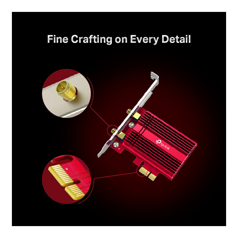 "TP-Link Archer TX3000E. Internal. Connectivity technology: Wireless, Host interface: PCI Express, Interface: WLAN / Bluetooth. Maximum data transfer rate: 2402 Mbit/s, Top Wi-Fi standard: Wi-Fi 6 (802.11ax), Wi-Fi band: Dual-band (2.4 GHz / 5 GHz). Product colour: Black, Red"\n"Next-Level Gaming