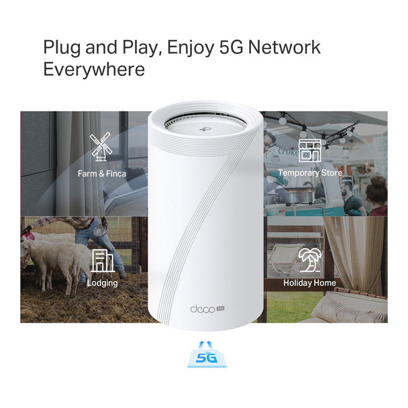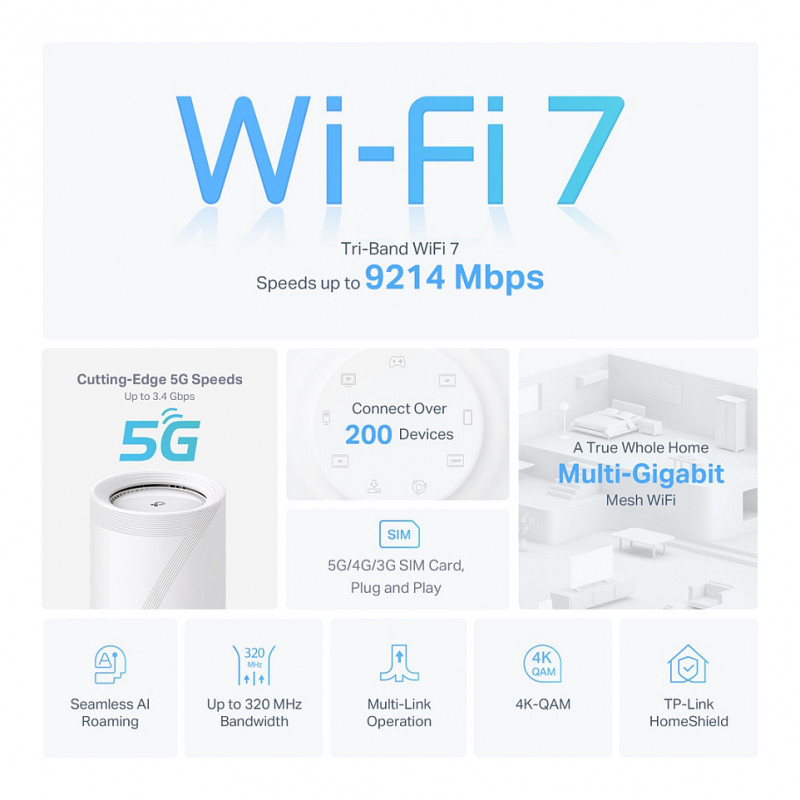 "TP-Link 5G BE9300 Whole Home Mesh Wi-Fi 7 Router, Build-In 5G Modem. Product colour: White, Antenna type: External, Product type: Mesh system. Wi-Fi band: Tri-band (2.4 GHz / 5 GHz / 6 GHz), Top Wi-Fi standard: Wi-Fi 7 (802.11be), WLAN data transfer rate (max): 9214 Mbit/s. Mobile network generation: 5G, 5G standard: Sub6, SIM card type: NanoSIM. Virtual assistant: Amazon Alexa & Google Assistant, Parental control features: Content filter, SafeSearch, Time controls, Youtube restriction, Operating modes: Router, AP. Ethernet LAN data rates: 100,1000,2500 Mbit/s"\n"Cutting-Edge 5G,