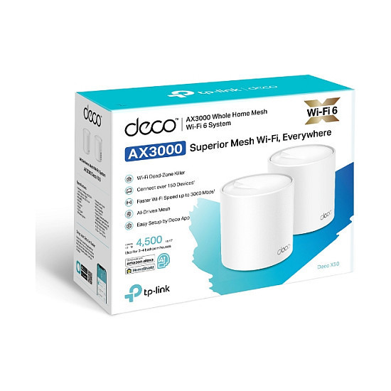 "TP-Link AX3000 Whole Home Mesh WiFi 6 System, 2-Pack. Product colour: White, Antenna type: Internal, Transmit power: CE: <20 dBm (2.4 GHz) <23 dBm (5 GHz) FCC: <30 dBm (2.4 GHz) <30 dBm (5 GHz). Wi-Fi band: Dual-band (2.4 GHz / 5 GHz), Top Wi-Fi standard: Wi-Fi 6 (802.11ax), Wi-Fi standards: 802.11a, 802.11b, 802.11g, Wi-Fi 4 (802.11n), Wi-Fi 5 (802.11ac), Wi-Fi 6 (802.11ax). Processor frequency: 1 GHz, Firewall security: SPI, Parental control features: Custom profiles, Time controls, Weekly/monthly reports. AC adapter output voltage: 12 V, AC adapter output current: 1.5 A. Compliance certificates: CE, RoHS"\n"Superior Mesh WiFi, Everywhere