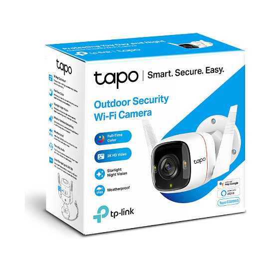 "TP-Link Tapo Outdoor Security Wi-Fi Camera. Type: IP security camera, Placement supported: Indoor & outdoor, Connectivity technology: Wireless. Mounting type: Wall, Product colour: White, Form factor: Bullet. Optical sensor size: 25.4 / 3 mm (1 / 3""). Fixed focal length: 3.18 mm. Night vision distance: 30 m, LED type: IR, Infra-red wavelength: 850 nm"\n"2K QHD, Clear and Bright Every Second