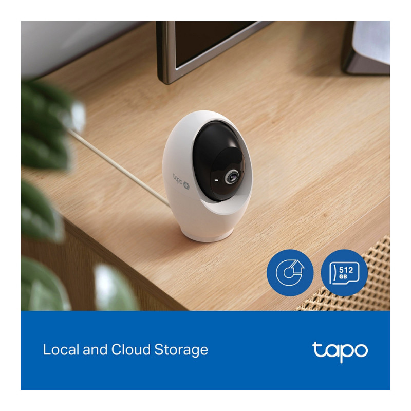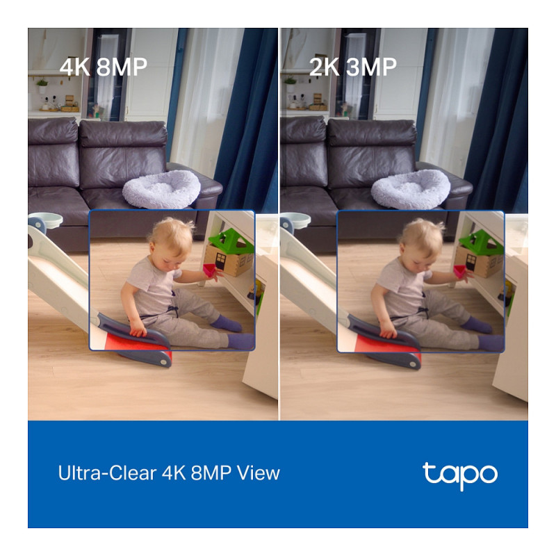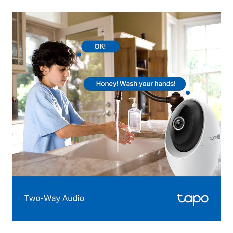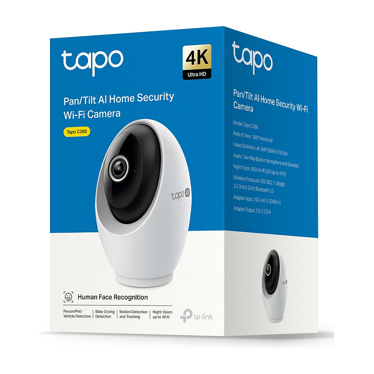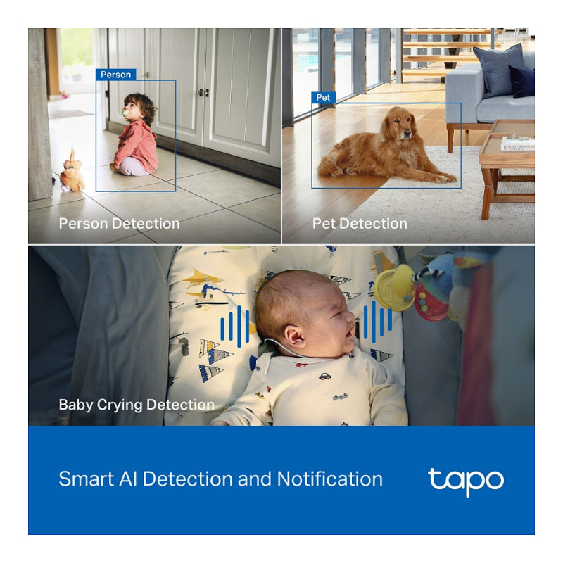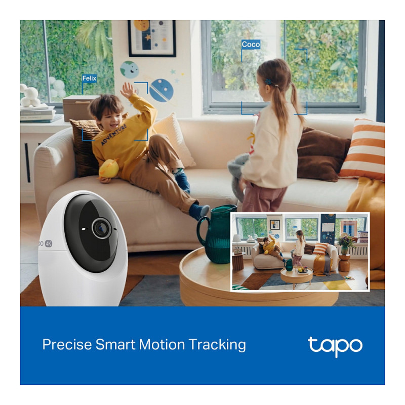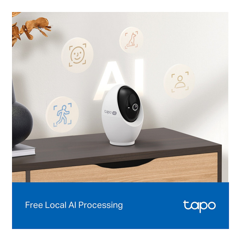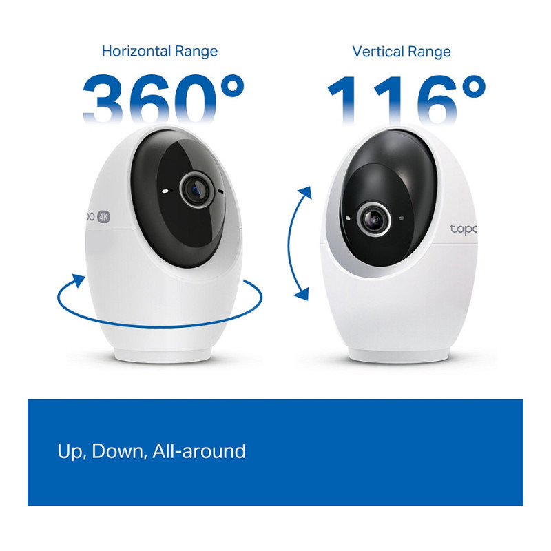 "TP-Link Tapo Pan/Tilt AI Home Security Wi-Fi Camera. Type: IP security camera, Placement supported: Indoor, Connectivity technology: Wireless. Mounting type: Ceiling/Wall/Desk, Product colour: White. Field of view (FOV) angle: 98°, Lens viewing angle, horizontal: 91.5°, Lens viewing angle, vertical: 46.1°. Sensor type: CMOS, Optical sensor size: 25.4 / 2.7 mm (1 / 2.7""). Digital zoom: 18x, Lens diameter: 6.9 mm, Focal length range: 4.3 mm"\n"Tapo 4K Clarity, Every Detail, Every Moment, Captured.
