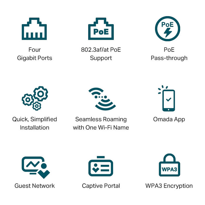 "TP-Link Omada AX3000 Wall Plate WiFi 6 Access Point. 2.4 GHz, 5 GHz, Maximum data transfer rate: 2402 Mbit/s. Security algorithms: HTTPS, SNMP, SNMPv2, SNMPv3, SSH, WPA-Enterprise, WPA2-Enterprise, WPA3-Enterprise. Ethernet LAN data rates: 10,100,1000 Mbit/s. Power over Ethernet (PoE). Product colour: White"\n"Match Your Room