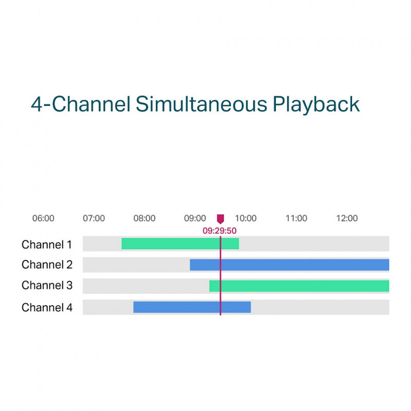 "TP-Link VIGI 4 Channel PoE+ Network Video Recorder. Video input channels: 4 channels, Maximum resolution: 3840 x 2160 pixels, Video recording modes: 720p, 1080p, 2160p. Maximum storage capacity: 10 TB, HDD interface: SATA. Supported network protocols: TCP/IP, DHCP, DNS, NTP, UPnP. Product colour: Black. Power consumption (typical): 4.25 W, Output current: 1.31 A, Output voltage: 53.5 V"\n"Security Never Shuts Down