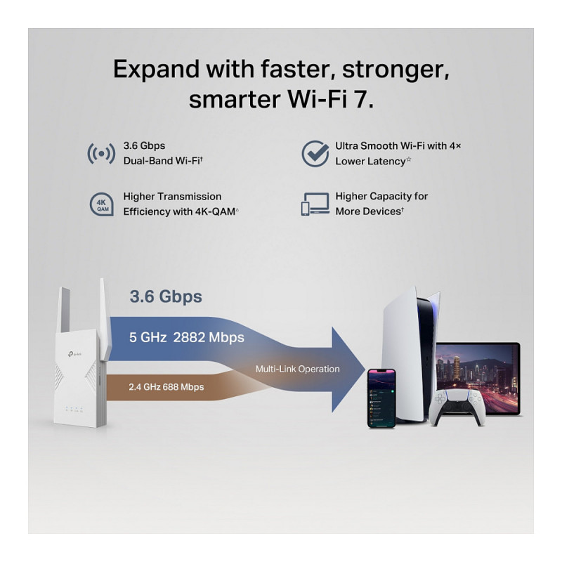 "TP-Link BE3600. Type: Network transmitter & receiver, Data transfer rate: 2882 Mbit/s, Ethernet LAN data rates: 2500 Mbit/s. Antenna type: External, Transmitting power (FCC): 30 dBm. Wi-Fi standards: 802.11a, 802.11b, 802.11g, Wi-Fi 4 (802.11n), Wi-Fi 5 (802.11ac), Wi-Fi 6 (802.11ax), Wi-Fi 7..., Wi-Fi band: Dual-band (2.4 GHz / 5 GHz), Bandwidth: 0.32 GHz. Product colour: White, Quantity per pack: 1 pc(s). AC input voltage: 100-240 V, AC input frequency: 50/60 Hz, Input current: 0.3 A"\n"Lightning-Fast 3.6 Gbps Dual-Band Wi-Fi 7: 2882 Mbps (5 GHz) + 688 Mbps (2.4 GHz).