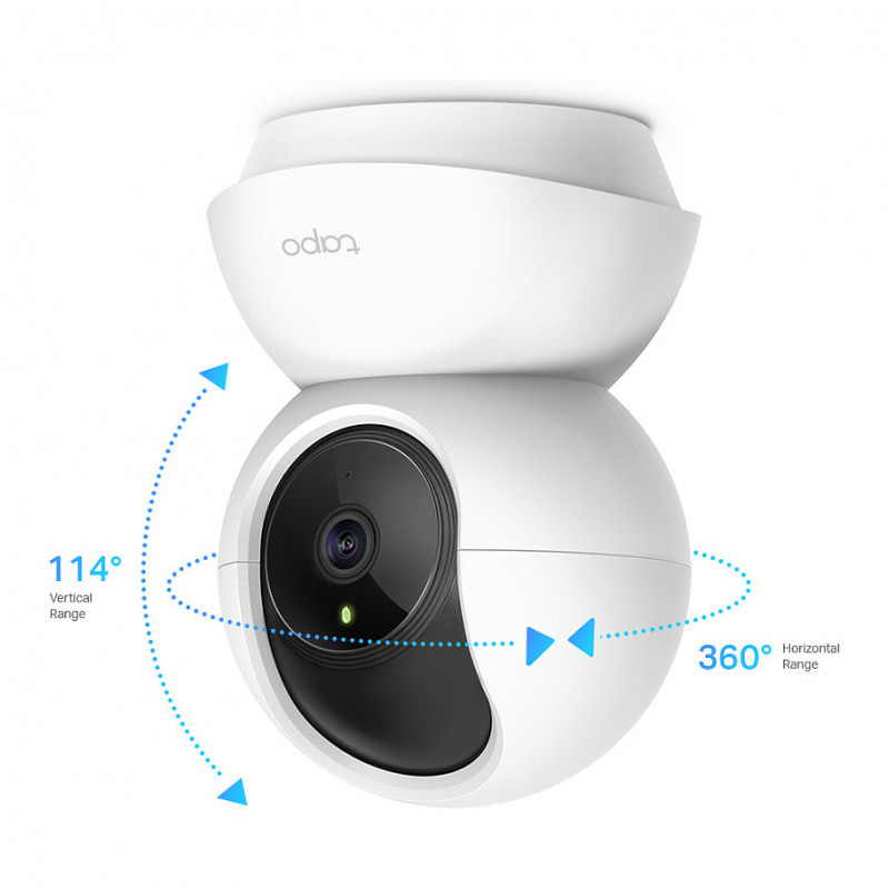 "TP-Link Tapo Pan/Tilt Home Security WiFi Camera. Type: IP security camera, Placement supported: Indoor, Connectivity technology: Wireless. Mounting type: Ceiling, Product colour: White, Form factor: Spherical. Angle of rotation: 360°, Tilt angle range: 0 - 114°, Pan range: 0 - 360°. Sensor type: MOS. Fixed focal length: 4 mm"\n"Wire-Free Ease,
