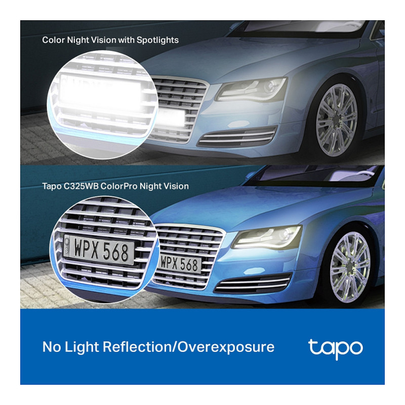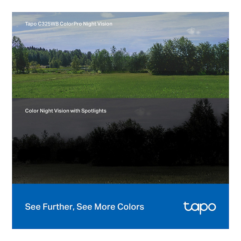 Compared with other full-color cameras with spotlights/floodlights, Tapo C325WB reveals brighter, more natural colors and clearer images with ColorPro night vision and 2688×1520 resolution.