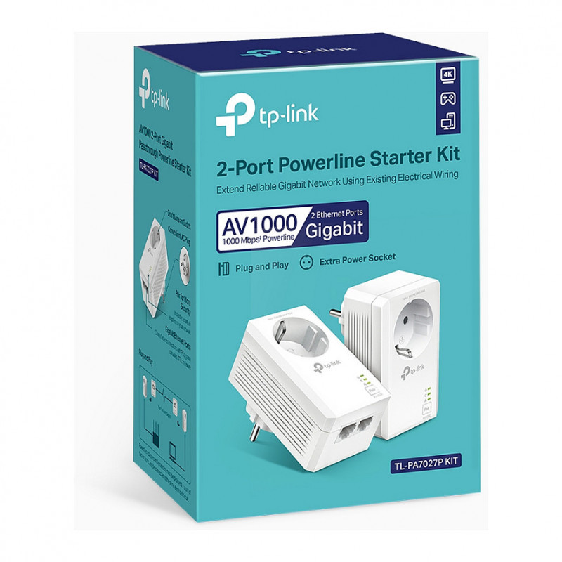 "TP-Link TL-PA7027P KIT. Maximum data transfer rate: 1000 Mbit/s, Networking standards: IEEE 1901, IEEE 802.3, IEEE 802.3u, Power plug: Type E / F. Power consumption (typical): 4 W, Power consumption (standby): 0.84 W. Product colour: White, Antenna type: Internal, LED indicators: LAN, Power. Windows operating systems supported: Windows 7, Windows 8, Windows 8.1, Windows Vista, Windows XP. Width: 58 mm, Depth: 42 mm, Height: 95 mm"\n"Extend a Gigabit Network via