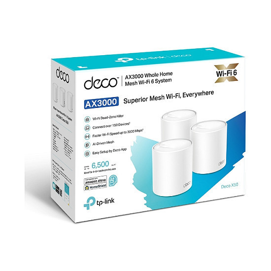 "TP-Link AX3000 Whole Home Mesh WiFi 6 System, 3-Pack. Product colour: White, Antenna type: Internal, Transmit power: CE: <20 dBm (2.4 GHz) <23 dBm (5 GHz) FCC: <30 dBm (2.4 GHz) <30 dBm (5 GHz). Wi-Fi band: Dual-band (2.4 GHz / 5 GHz), Top Wi-Fi standard: Wi-Fi 6 (802.11ax), Wi-Fi standards: 802.11a, 802.11b, 802.11g, Wi-Fi 4 (802.11n), Wi-Fi 5 (802.11ac), Wi-Fi 6 (802.11ax). Processor frequency: 1 GHz, Firewall security: SPI, Parental control features: Custom profiles, Time controls, Weekly/monthly reports. AC adapter output voltage: 12 V, AC adapter output current: 1.5 A. Compliance certificates: CE, RoHS"\n"Superior Mesh WiFi, Everywhere.