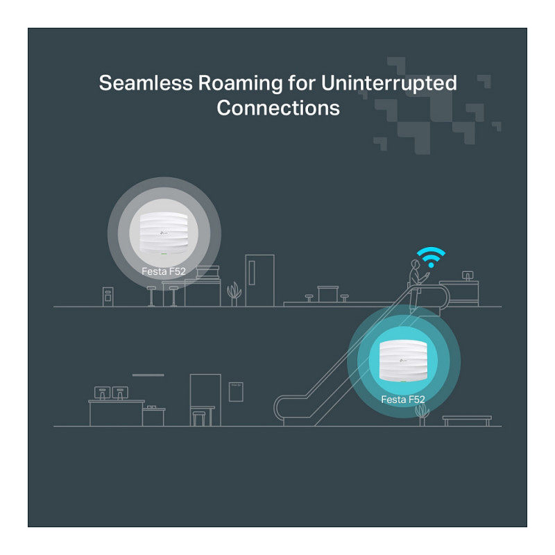 "TP-Link FESTA F52. 2.4 GHz, 5 GHz, Maximum data transfer rate: 867 Mbit/s. Security algorithms: WPA, WPA2. Power over Ethernet (PoE). Product colour: White"\n"Festa offers business-class features with consumer-inspired simplicity. Our free cloud-based centralized management is accessible via the Festa app or web, providing essential features for small businesses without the complexity required by larger-scale operations.