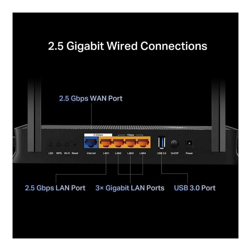 1× 2.5 Gbps WAN port and 1× 2.5 Gbps LAN port make full use of the Gigabit speeds from your local ISP. Breakthrough the 1G bottleneck and drive your devices to peak performance.
