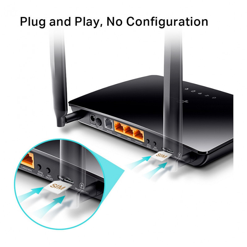 "TP-Link N300 4G LTE Telephony WiFi Router. WAN connection type: RJ-45. Wi-Fi band: Single-band (2.4 GHz), Top Wi-Fi standard: Wi-Fi 4 (802.11n), WLAN data transfer rate (max): 300 Mbit/s. Ethernet LAN interface type: Fast Ethernet, Ethernet LAN data rates: 10,100 Mbit/s, Cabling technology: 10/100Base-T(X). Mobile network generation: 4G, 3G standards: DC-HSPA+, HSPA, HSPA+, UMTS, 4G standard: LTE-TDD & LTE-FDD. Security algorithms: 64-bit WEP, 128-bit WEP, WPA, WPA-PSK, WPA2, WPA2-PSK, Firewall security: : DoS, SPI Firewall, IP and MAC Address Binding"\n"Enjoy WiFi and Phone Calls All in One 4G Router