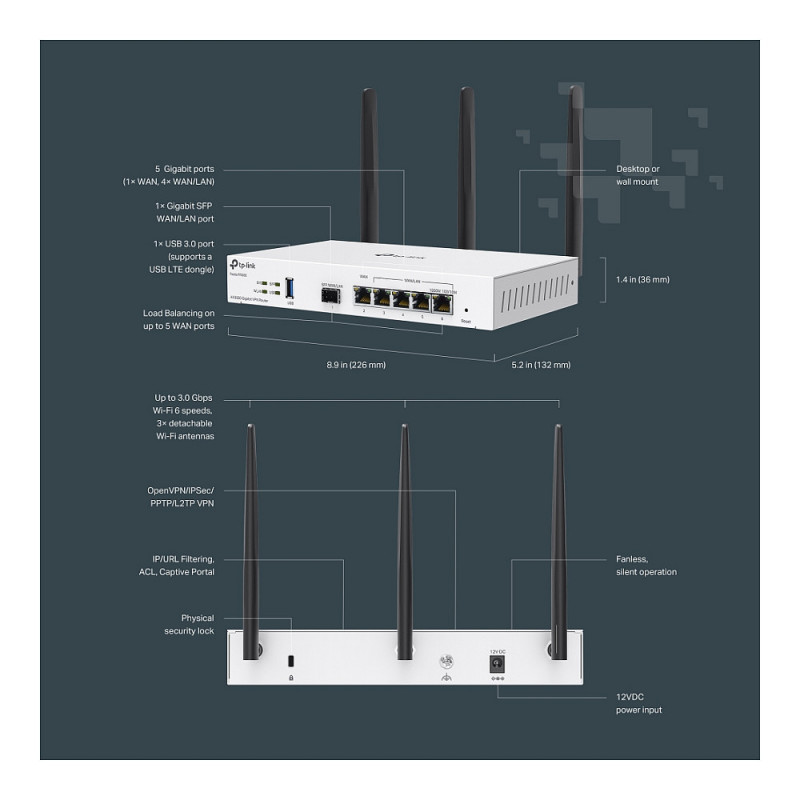 "TP-Link FESTA FR365. WAN connection type: RJ-45. Wi-Fi band: Dual-band (2.4GHz + 5GHz or 2.4GHz + 6GHz), Top Wi-Fi standard: Wi-Fi 6 (802.11ax), WLAN data transfer rate (max): 2402 Mbit/s. Ethernet LAN interface type: Gigabit Ethernet, Networking standards: IEEE 802.11ac, IEEE 802.11ax, IEEE 802.11n. Security algorithms: SNMP, SNMPv2, SNMPv3, WPA, WPA2, WPA3. Product type: Tabletop router, Product colour: White"\n"Festa 一 A Networking Solution Built For Small Business, No IT Required