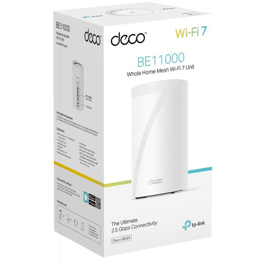 "TP-Link BE9300 Whole Home Mesh Wi-Fi 7 Unit (Tri-Band). Product colour: White, Antenna type: Internal, Product type: Mesh system. Wi-Fi band: Tri-band (2.4 GHz / 5 GHz / 6 GHz), Top Wi-Fi standard: Wi-Fi 7 (802.11be), WLAN data transfer rate (max): 11000 Mbit/s. Virtual assistant: Amazon Alexa & Google Assistant, Cloud services supported: TP-Link ID, Parental control features: Bedtime, Custom profiles, Family online time ranking, Family time, Off time, Pause the Internet,.... Certification: CE, FCC, RoHS. Width: 107.5 mm, Depth: 107.5 mm, Height: 176 mm"\n"WiFi 7, WiFi Like Never Before
