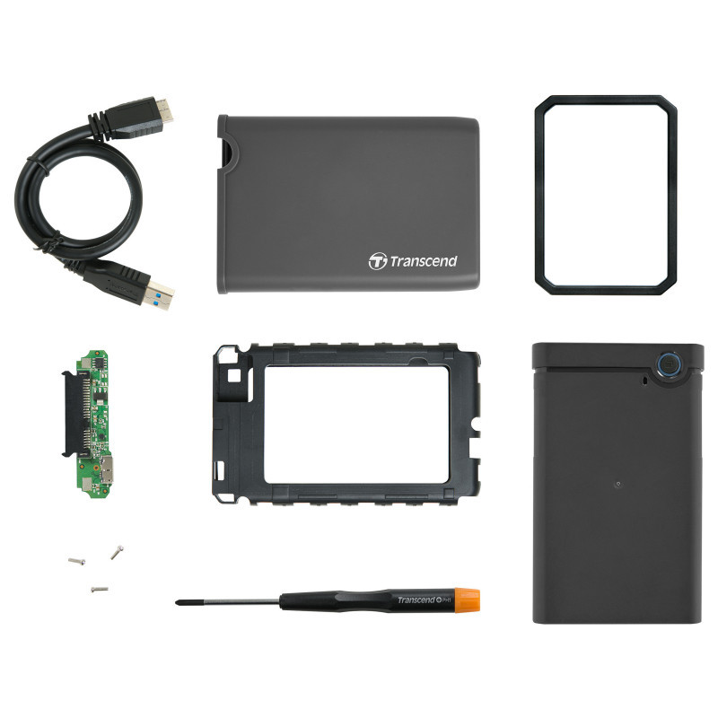 "Transcend 2.5” SSD/HDD Enclosure Kit. Product type: HDD/SSD enclosure. Number of storage drives supported: 1, Storage drive size: 2.5"", Supported storage drive interfaces: Serial ATA III. Product colour: Grey. USB connector type: Micro-USB, USB Type-A"\n"What do you do with the old hard drive removed from your laptop? Don't throw it away, reuse it! Transcend's SSD/HDD Upgrade Kit comes with all the tools you need to reuse the 2.5-inch hard drive removed from your notebook. Follow the step-by-step installation guide to find useful tips and assembly instructions. The kit also features a one-touch backup function, so download the Transcend Elite software from our website to better manage your data!