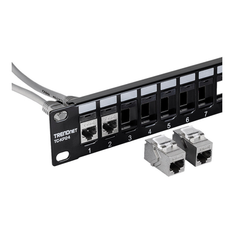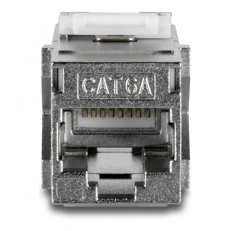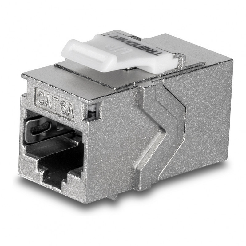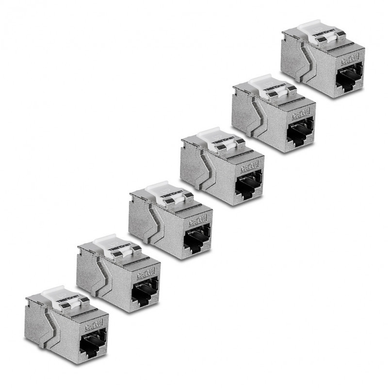 "Trendnet TC-KC06C6A. Construction type: Flat, Product colour: Silver, Connector 1: RJ-45. Width: 22 mm, Depth: 38 mm, Height: 17 mm. Quantity per pack: 6 pc(s)"\n"TRENDnet’s Cat6A RJ-45 Keystone Inline Coupler (6-Pack), model TC-KC06C6A, includes six Cat6A keystone couplers for use with TRENDnet’s blank keystone patch panels. These metal keystone jack inline couplers are designed for gigabit and 10G copper Ethernet network applications. Each keystone inline coupler is designed for use with Cat6A cabling, eliminating EMI and crosstalk to ensure peak performance and data integrity. These Cat6A keystone inline couplers feature a convenient tool-less design for easy cable installation."