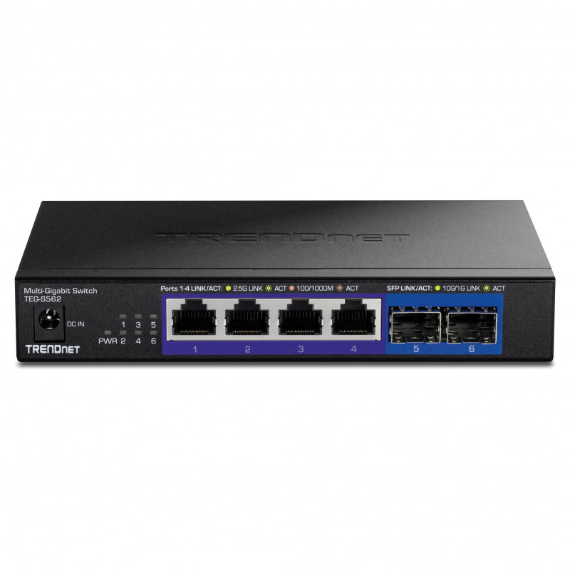 "Trendnet TEG-S562. Switch type: Unmanaged. Basic switching RJ-45 Ethernet ports type: 2.5G Ethernet (100/1000/2500), Basic switching RJ-45 Ethernet ports quantity: 4. Full duplex. MAC address table: 4000 entries, Switching capacity: 60 Gbit/s. Networking standards: IEEE 802.1x, IEEE 802.3ab, IEEE 802.3ae, IEEE 802.3an, IEEE 802.3bz"\n"Expand your network’s bandwidth and reduce traffic bottlenecks with TRENDnet’s Unmanaged Multi-Gigabit Switches. This 2.5G switch with SFP+ support comes equipped with 2.5GBASE-T RJ-45 ports that provide higher gigabit speeds capable of up to 2.5Gbps over your existing Cat5e or better cabling. The 2.5G switch with 10G fiber also offers two dedicated 10G SFP+ ports for high-speed network connections, providing a cost-effective solution in adding 10G link capability to an SMB network. The fanless design lowers energy consumption and eliminates distracting operating noise. TRENDnet’s reliable multi-gigabit switches are cost-effective solutions to increase your network’s throughput."