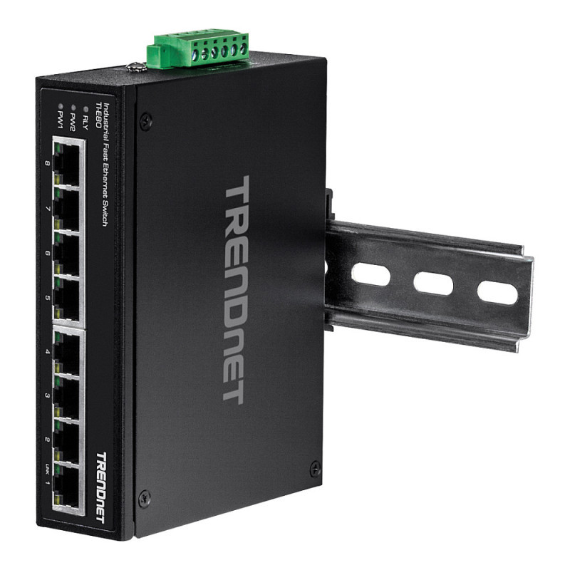 "Trendnet TI-E80. Switch type: Unmanaged. Basic switching RJ-45 Ethernet ports type: Fast Ethernet (10/100), Basic switching RJ-45 Ethernet ports quantity: 8. Full duplex. MAC address table: 1000 entries, Switching capacity: 1.6 Gbit/s. Networking standards: IEEE 802.3, IEEE 802.3ab, IEEE 802.3u, IEEE 802.3x. DC input voltage: 12 - 56 V. Wall mountable"\n"TRENDnet's Industrial Fast Ethernet DIN-Rail Switches feature a rugged IP30 rated metal enclosure. These industrial Ethernet switches are designed to withstand high levels of vibration and shock, operate in both low and high temperatures for industrial environments within a -40° – 75° C (-40° – 167° F) wide-temperature range. Redundant power inputs with overload current protection on each industrial Ethernet switch minimizes network downtime."