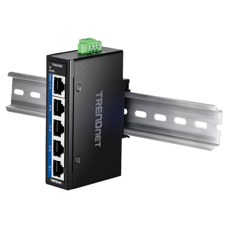 "Trendnet TI-GLC50. Switch type: Unmanaged. Basic switching RJ-45 Ethernet ports type: Gigabit Ethernet (10/100/1000), Basic switching RJ-45 Ethernet ports quantity: 5. Full duplex. MAC address table: 2000 entries, Switching capacity: 10 Gbit/s. Networking standards: IEEE 802.3, IEEE 802.3ab, IEEE 802.3u, IEEE 802.3x. DC input voltage: 9.6 - 60 V. Wall mountable"\n"TRENDnet’s 5-Port Industrial Gigabit DIN-Rail Mini Switch, model TI-GLC50, is a reliable and rugged networking solution designed for use in both extreme and demanding environments. This Industrial Gigabit DIN-Rail Mini Switch features a rugged IP30 rated metal enclosure, and is designed to withstand a high degree of vibration and shock, while operating in both high and low temperatures for industrial environments within -40° – 75° C (-40° – 167° F). The hardened industrial switch features five copper gigabit ports for high-speed device connections. The mini-sized housing is designed to fit into most compact installation areas.