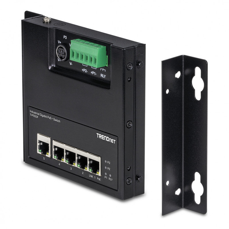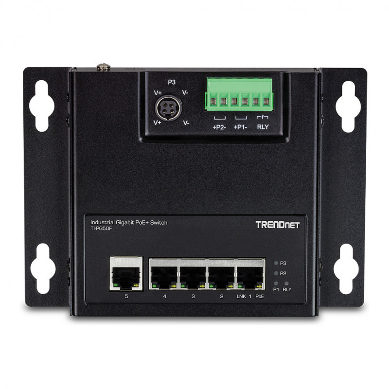 "Trendnet TI-PG50F. Switch type: Unmanaged. Basic switching RJ-45 Ethernet ports quantity: 5. MAC address table: 2000 entries, Switching capacity: 10 Gbit/s. Networking standards: IEEE 802.3, IEEE 802.3ab, IEEE 802.3af, IEEE 802.3at, IEEE 802.3u, IEEE 802.3x. Power over Ethernet (PoE)"\n"TRENDnet’s Industrial Gigabit PoE+ Wall-Mounted Front Access Switch Series are well suited for IP surveillance, IoT, and automation networks for homes and businesses. These hardened industrial gigabit flat switches provide front access to ports and power interfaces for easier installation. The flat and compact size make them ideal for cabinet installations where space is limited. Each hardened industrial front access switch features gigabit PoE+ ports for connecting devices such as wireless access points, IP cameras, and IoT appliances. These hardened front access switches come equipped with an IP30 rated metal enclosure, designed to withstand a high degree of vibration and shock, while operating within a wide temperature range of -40° – 75° C (-40° – 167° F) for industrial environments.