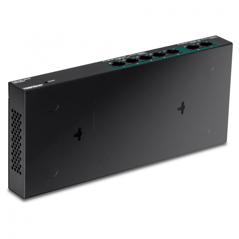 "Trendnet TPE-TG327. Switch type: Unmanaged. Basic switching RJ-45 Ethernet ports type: Gigabit Ethernet (10/100/1000), Basic switching RJ-45 Ethernet ports quantity: 5. MAC address table: 2000 entries, Switching capacity: 20 Gbit/s. Networking standards: IEEE 802.3ab, IEEE 802.3af, IEEE 802.3at, IEEE 802.3bz, IEEE 802.3x, IEEE 802.3z. DC input voltage: 55 V. Power over Ethernet (PoE). Wall mountable"\n"TRENDnet’s 7-Port Multi-Gig PoE+ Switch, model TPE-TG327, is an affordable 2.5G PoE+ switch that provides advanced high-bandwidth performance, ease of use, and reliability. The TPE-TG327 multi-gig switch offers two dedicated 2.5G PoE+ ports and five dedicated 1G PoE+ ports for high-speed network connections with a 20Gbps switching capacity. Having a sturdy compact metal housing and fanless design, the multi-gig PoE+ switch is a cost-effective solution for high-speed network connections. A 70W total PoE power budget on this affordable multi-gig PoE+ switch supplies up to seven PoE+ devices with up to 30W per port."