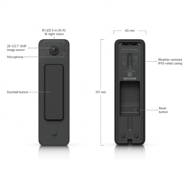 "Ubiquiti Doorbell Lite. Product colour: Black, Housing material: Metal, Polycarbonate (PC). Connection type: Wired, International Protection (IP) code: IPX5. Megapixel (approx.): 5 MP, Maximum video resolution: 2560 x 1920 pixels, Frame rate: 24 fps. Power source type: PoE. Width: 40 mm, Depth: 26.4 mm, Height: 137 mm"\n"Compact PoE video doorbell with two-way audio and versatile mounting options."