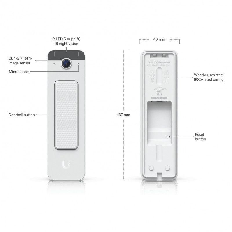 "Ubiquiti Doorbell Lite. Product colour: White, Housing material: Metal, Polycarbonate (PC). Connection type: Wired, International Protection (IP) code: IPX5. Megapixel (approx.): 5 MP, Maximum video resolution: 2560 x 1920 pixels, Frame rate: 24 fps. Power source type: PoE. Width: 40 mm, Depth: 26.4 mm, Height: 137 mm"\n"Compact PoE video doorbell with two-way audio and versatile mounting options."