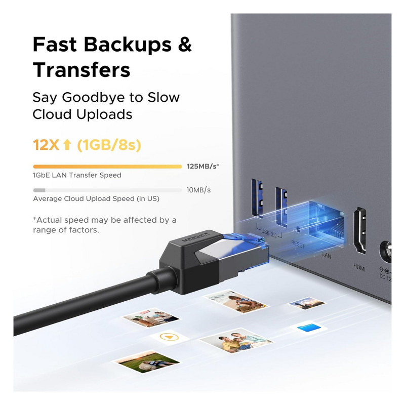Blazing Speed, Minimal Power: Equipped with a high-performance processor, 1GbE port, and 4GB LPDDR4X RAM, this NAS handles multiple tasks with ease. File transfers reach up to 125MB/s—a 1GB file takes only 8 seconds. Don't let slow clouds hold you back; they often need over 100 seconds for the same task. The difference is clear.