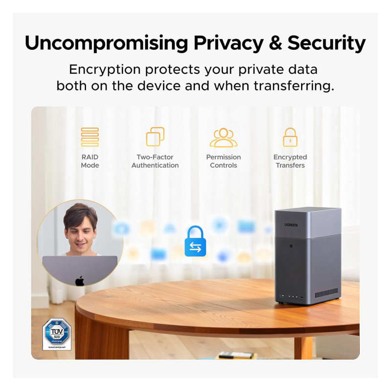 Uncompromising Privacy & Security: You own your data, stored on your drives—no third-party clouds, no hidden access. To provide end-to-end protection for your data against leaks or loss—whether the data is stored or in transit—this UGREEN NAS incorporates layered security features like RAID modes, two-Factor Authentication, permission controls, and encrypted transfers. Backed by TRUSTe certification, it’s also the first and only NAS certified by TÜV SÜD to meet the ETSI EN 303 645 standard."
