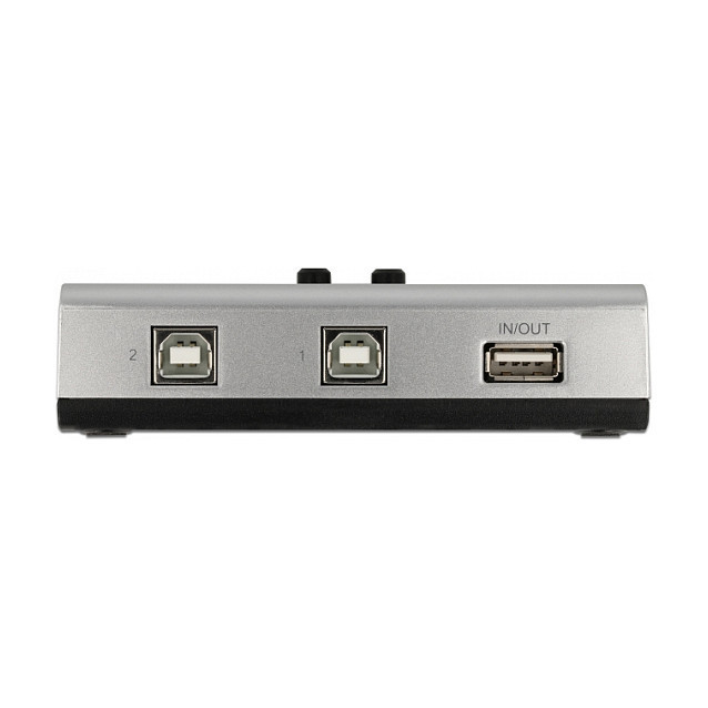 "DeLOCK Switch USB 2.0 with 2 x Type-B female to 1 x Type-A female manual bidirectional. Maximum data transfer rate: 0.48 Gbit/s, Product colour: Black, Silver, Housing material: Plastic. Width: 71 mm, Depth: 112 mm, Height: 32 mm"\n"This bidirectional USB 2.0 switch by Delock offers two computers the possibility to share a USB peripheral device on the USB Type-A port. With the two buttons on the switch, one of the two computers can establish a USB connection to the peripheral device. Printers, card readers, hard drives etc. can be specifically activated and made available to a computer."