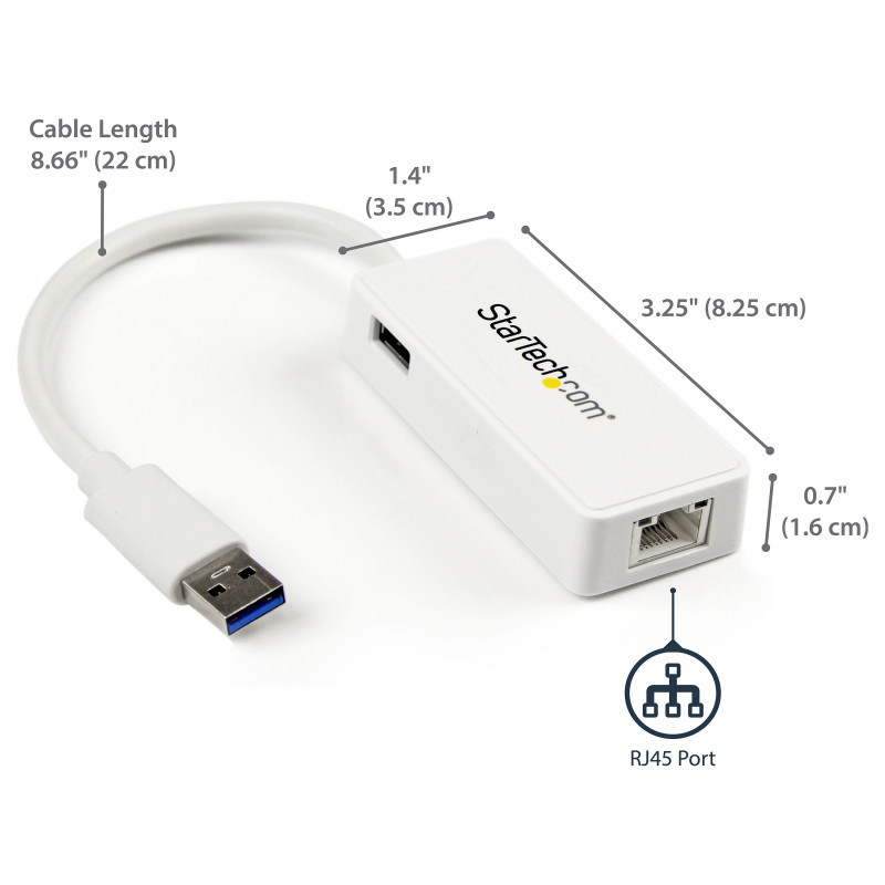 "StarTech.com USB 3.0 to Gigabit Ethernet Adapter NIC w/ USB Port - White. Connectivity technology: Wired, Host interface: RJ-45, Interface: USB. Maximum data transfer rate: 5000 Mbit/s. Product colour: White"\n"Add a Gigabit Ethernet port and a USB 3.0 pass-through port to your laptop through a single USB 3.0 port