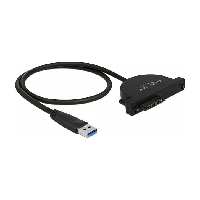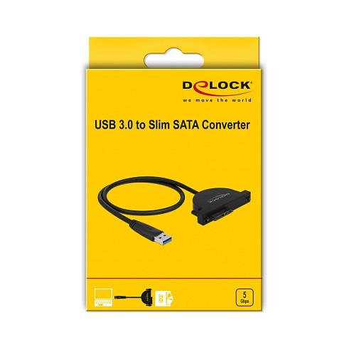 "DeLOCK 64048. Product colour: Black, Country of origin: China. Chipset: JMicron JMS578. Package type: Box. Data transfer rate: 6 Gbit/s, Cable length: 0.35 m"\n"This Delock converter can be connected via USB Type-A interface to a PC or laptop. Thus a Slim SATA device e.g. an optical drive with a 13 pin SATA interface can be used."